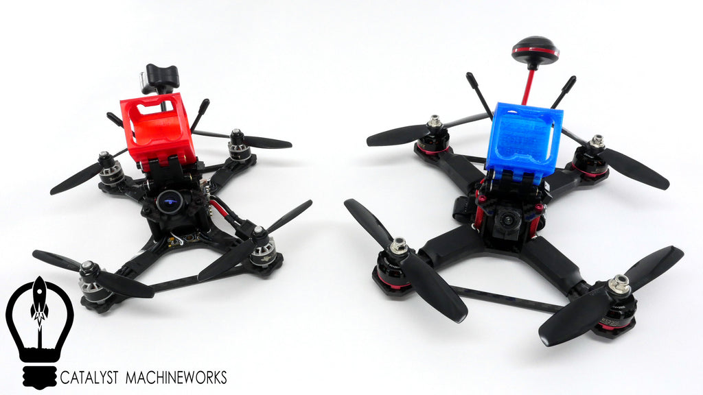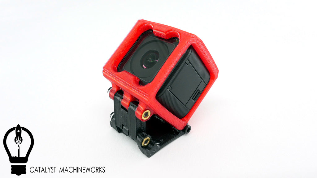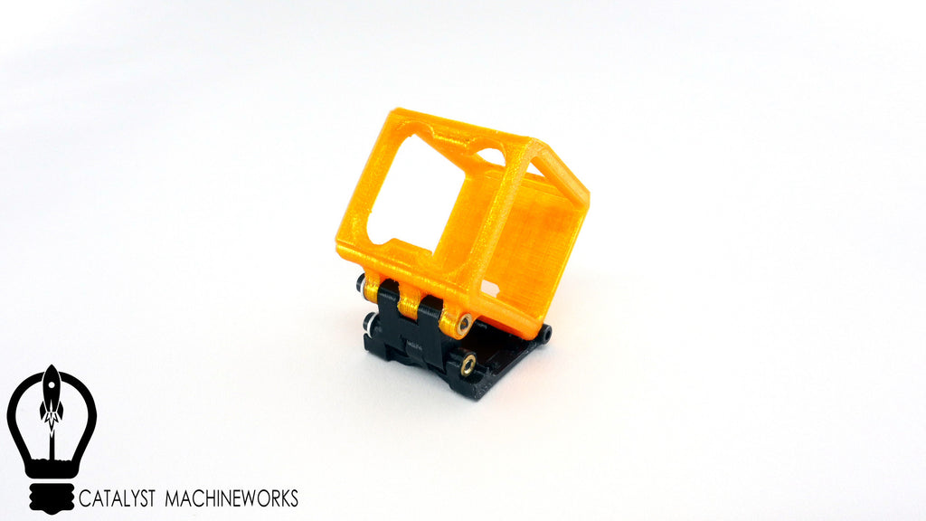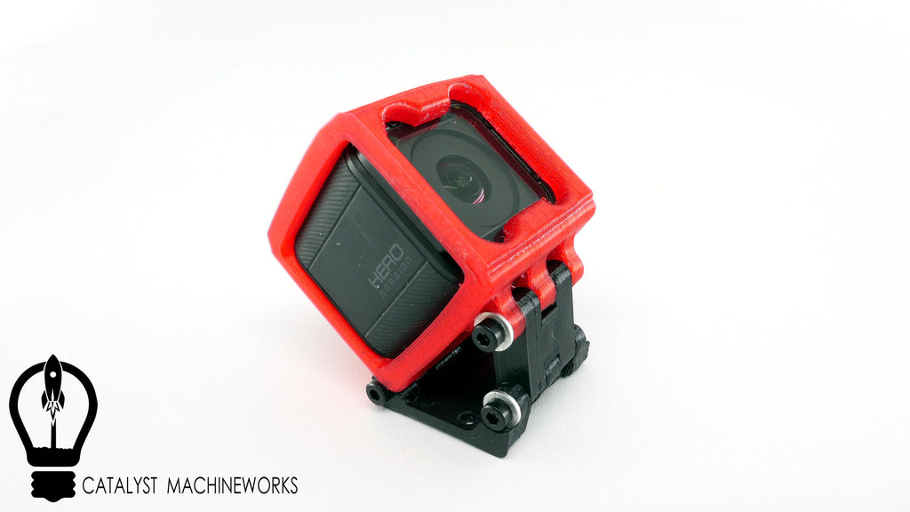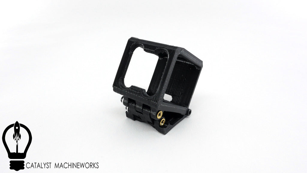 The top portion of the mount is made of highly durable and flexible TPU. This material is incredibly tough and resilient. TPU has become the gold standard in FPV racing camera protection. The two lower plastic parts of the mount are made of a Catalyst Machineworks "secret sauce plastic". This material is similar to TPU but harder, while still having the ideal amount of flex needed to not break even during the most insane crashes. All fasteners included with the mount are made of 7075 aircraft grade aluminum, anodized black. The two lower plastic parts of the mount are always black, while you have various color options available for the top portion.