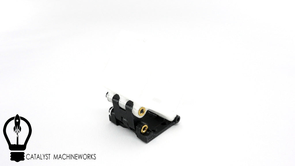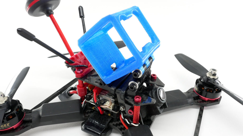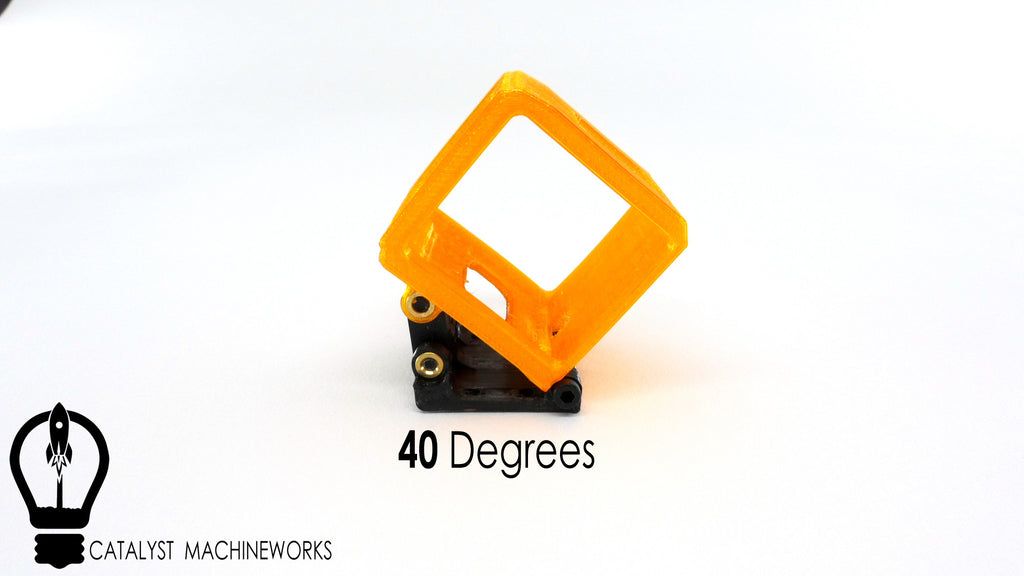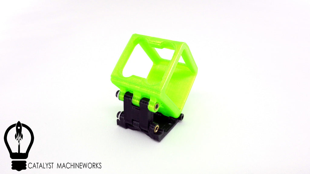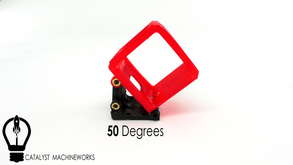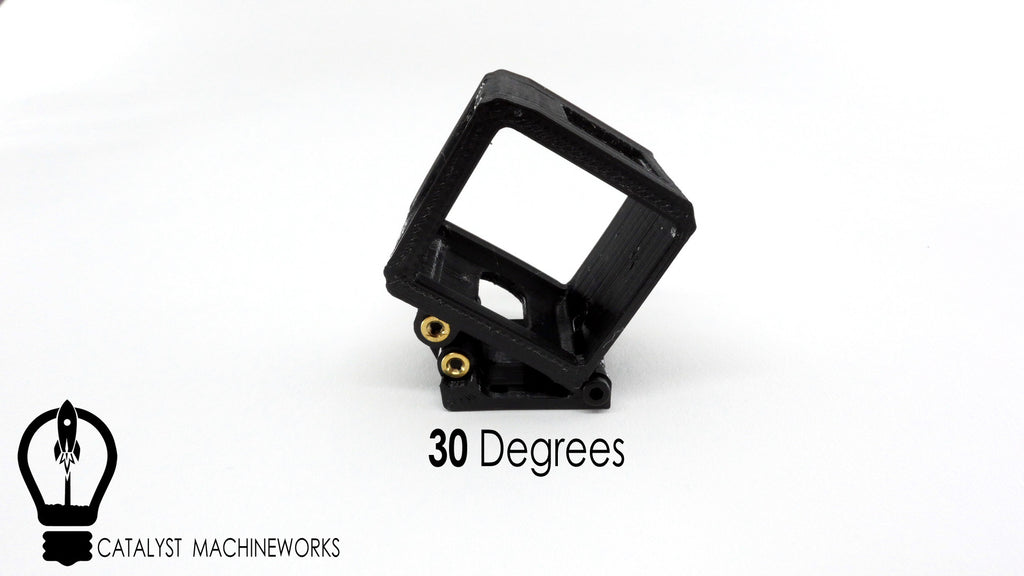 The top portion of the mount is made of highly durable and flexible TPU. This material is incredibly tough and resilient. TPU has become the gold standard in FPV racing camera protection. The two lower plastic parts of the mount are made of a Catalyst Machineworks "secret sauce plastic". This material is similar to TPU but harder, while still having the ideal amount of flex needed to not break even during the most insane crashes. All fasteners included with the mount are made of 7075 aircraft grade aluminum, anodized black. The two lower plastic parts of the mount are always black, while you have various color options available for the top portion.