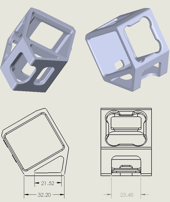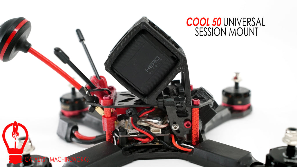 The 'Cool Mount' is designed to attach the GoPro Session 4 or 5 to a wide range of FPV racing craft. Not only will it fit our Speed Addict SuperLight, but you can strap this puppy down to other manufacturer frames as well. Made of flexible and durable TPU this mount will handle crashes like a champ and keep your expensive camera safe and sound. The mount is held down by two zip ties. This 'zip tie' method works surprisingly well and is very crash resilient. Reference the dimensional information below to determine if this mount will fit your FPV racer.