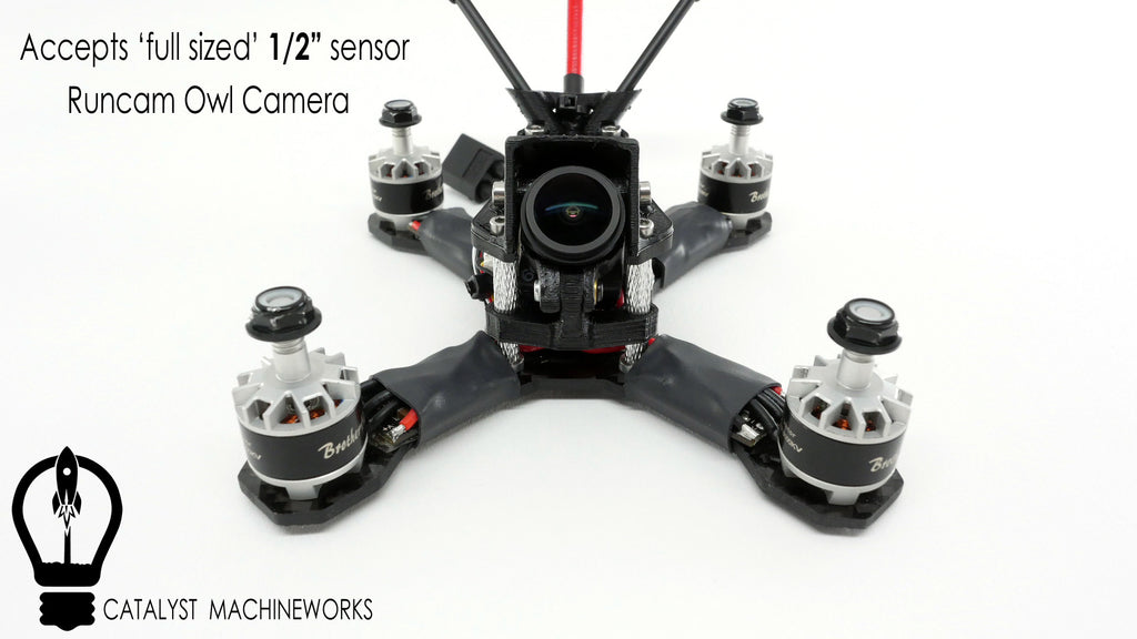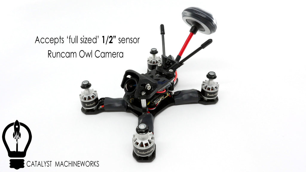 - Supported FPV Cameras: Mini Cam (1.8), Mini Cam (2.8), Runcam Owl (runcam mount sold separately)