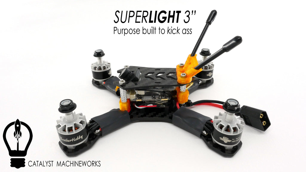The Speed Addict SuperLight was forged out of beautiful carbon fiber and aluminum by the FPV gods and then transported to this planet for the soul purpose of beating the crap out of everyone else on the race track. On the day of it's arrival on earth all the Gram Chasers and Weight Nazi's gathered around to behold it's greatness. Today will forever go down in the FPV history books as the day Catalyst Machineworks entered the super light weight frame world. Do you find yourself wondering if clear shrink tubing is lighter than black shrink tubing? Do you put your quads on a diet of no ESC plugs, 400mah lipos, and super short wiring runs all the while telling your friend his 200 gram AUW quad 3" is a fat ass? Welp, this frame is for you!